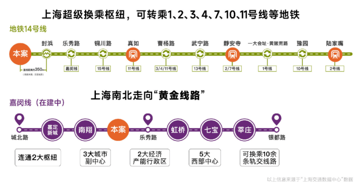 交通能级不断跃升: 14号线和嘉闵线(在建中)双轨交汇,直线距离约350米14号线地铁口,14号线为高能级地铁线,5站普陀,直达静安,且始发有座,出行舒适;黄金走廊嘉闵线加速建设,约3站虹桥枢纽,未来可速达七宝、徐家汇、莘庄等核心区域。项目周边开泰路即将建成,绿野谷二期路段、骏达路、童家桥路、昌瑞路、涟澜路已启动建设,预计2026年建成。