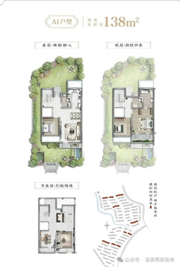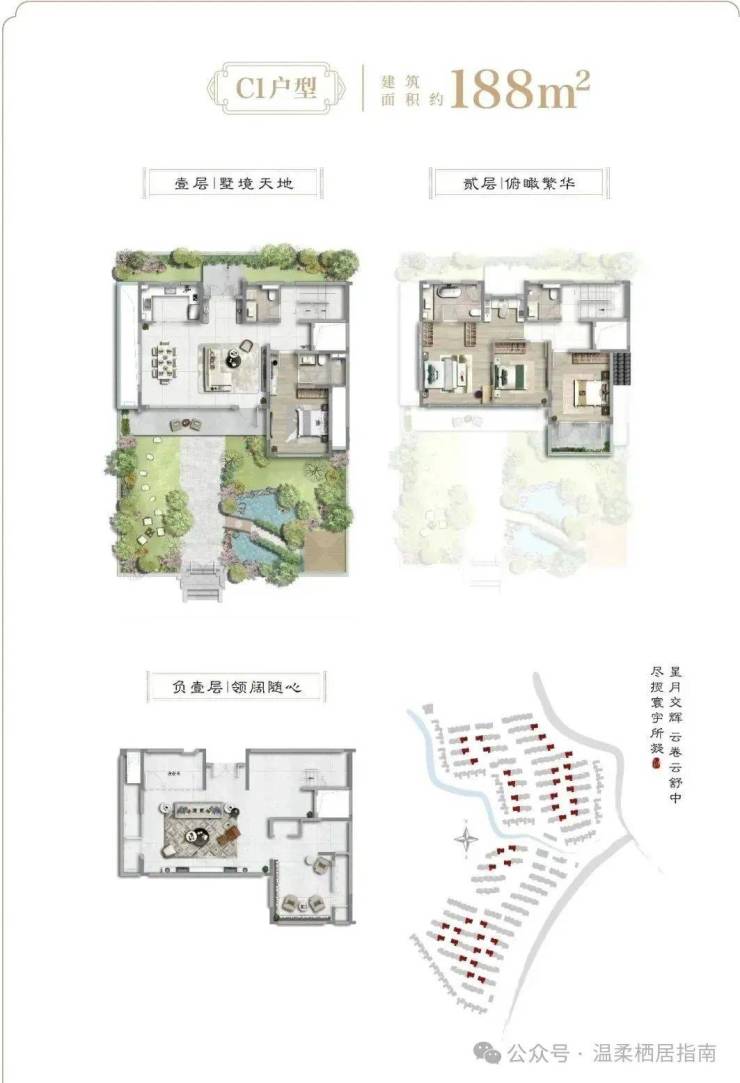 从户型设计上看:建面约138-188㎡联排与建面约211-214㎡院墅产品,庭前绿地,大面宽,地上仅2层,真正的低密宽境别墅,产品力断层式领先。