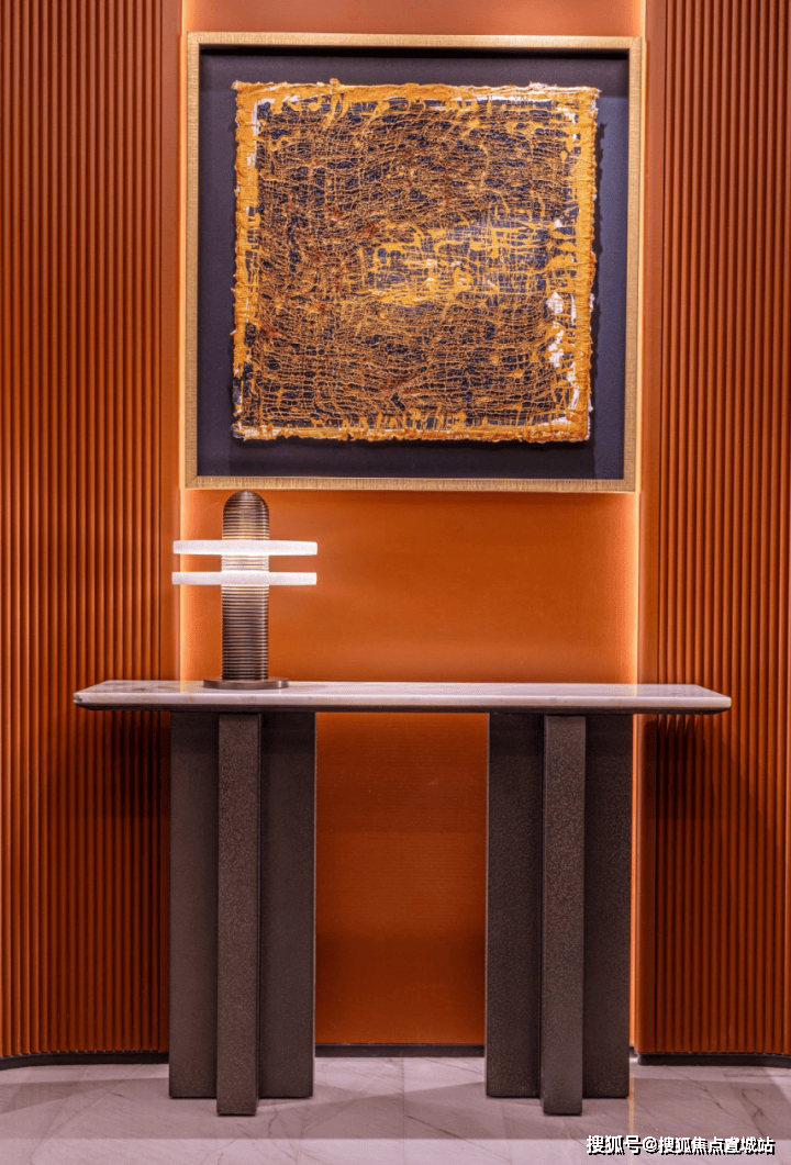 露香园天誉售楼处电话:400-8855-420厅堂右墙上放置一幅超大尺度的以石库门砖墙为元素的肌理挂画《城市的记忆》,在展厅的厅堂空间,设计师则摆放着一座极具雕塑感的法国ARTDECO羊皮纸拂面工艺所制作的圆桌,左侧的走廊选用艺术家高级定制的瓷片水墨装置,呈现露香园四宝“顾振海墨”的人文气息,展现出露香园独特的、高级的美学品位。