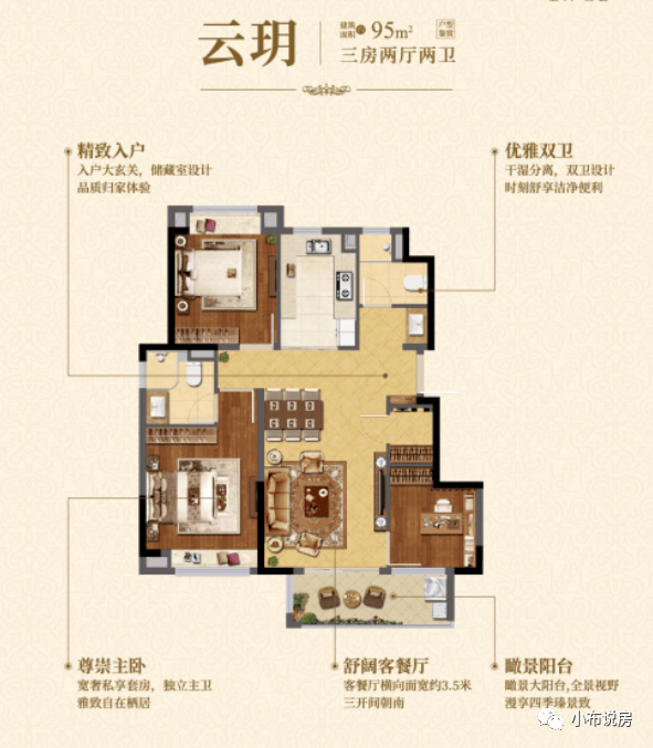 约95㎡三房两厅两卫,做到了三开间朝南+瞰景大阳台+主卧套房设计+南北通透+卫生间干湿分离