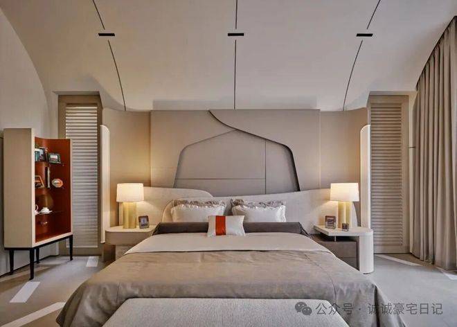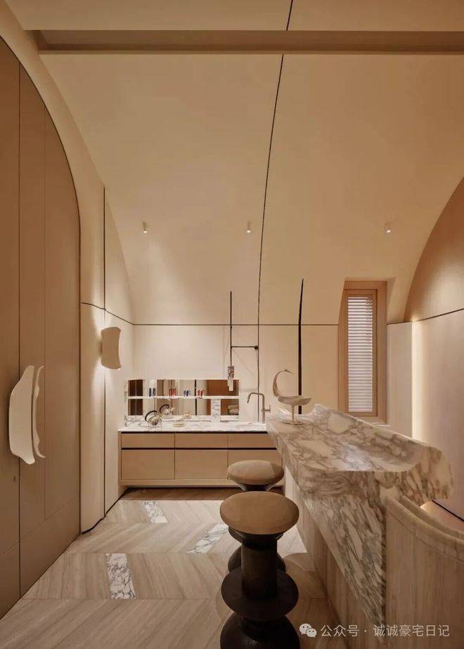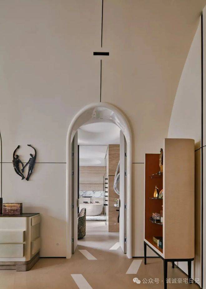顶层专属于主卧,推开双开门,拱形天花设计尽显浪漫,挑高至3.8米,一条长灯带自浴室贯穿至整个卧房,分置于灯带两侧的弧形结构,环抱出一份安心。而其床头背板也被设计成拥抱的视效,为空间增添温暖包裹的氛围。