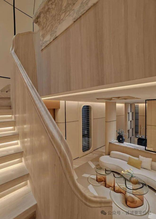 顺着弧形木质楼梯抵达地下空间,仿佛游走在一曲流动的乐章中。一切都共同呼应着水的特质,传递着低调隐逸情怀与圆融个性。