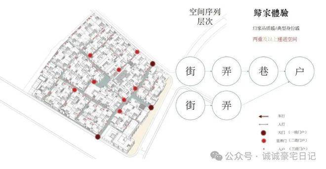 士林润园社区规划可分为蓬莱路城市公共景观以及社区内部景观两个部分,其中市政绿地衔接于上海2035城市总体规划中“蓝绿丝带”的上位条件要求,社区内部街巷空间形成空间序列形成递进的层次,将归家体验的序列依次展开,形成城市街道→入口(一级门户)→街巷→节点空间→里弄门(二级门户)→合院入户(三级门户)的方式,基本可保证大多数住户可体验到两重以上的空间递进。
