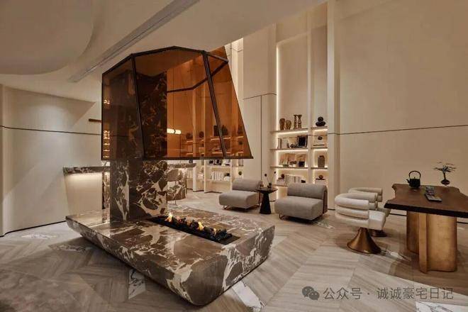 这一层更聚焦于私谈、影音、娱乐、品酒、饮茶,深沉又静谧。近6米高的垂直挑空玻璃壁炉矗立于眼前,如同一件令人赞叹不已的大型雕塑装置,它弱化了空间中的大理石承重柱,将其纳入共同构成一个完整的全新的装置,集功能性与艺术性于一身。