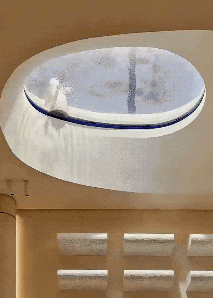 这一水景装置亦是功能性天窗,为地下空间提供自然采光,深具巧思。这一手法也打破了常规的天井设置,家犹如活泼的生活剧场,为一幕幕故事的上演预备好激发想象力的艺术场域。