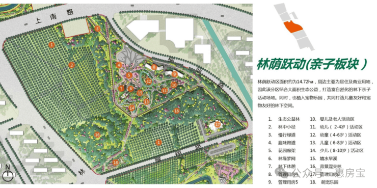 整座公园 (在建中 ) 划分为:湿地花园区、鸣湖共享区、林荫跃动区和社邻园艺区,四大功能分区。