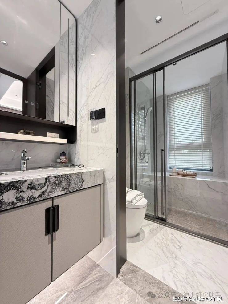 奢石台面,皮革饰面柜抽屉,侧端设置金属收纳开放格;定制镜柜,中间的透光玉石直接提升了高级感,镜柜内部配备了美妆冰箱+美妆灯条+轨道收纳!