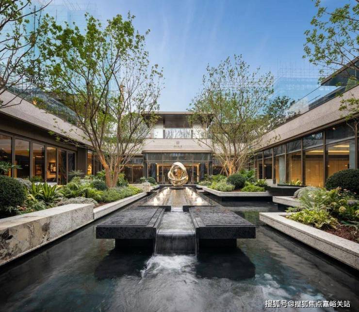 穿过会客厅即是水森庭院。中轴水景与6株元宝枫,矗立在这片由黑金沙铺成,范思哲黑与潘多拉奢石点缀于此的水院中。