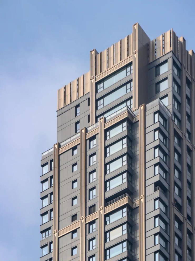 项目外立面通过 古铜色、深灰色+铝板、 镜面铝板 的完美搭配,再镶嵌竖向线条和立面层次 ,体现出威仪肃穆的高级感。