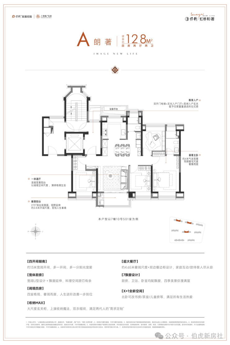 ◎真四开间朝南: 据统计,2024年至今的上海新房市场中,建面在125-130㎡产品只有约9%做到了真四开间朝南,而地铁口的4房产品更是少之又少(数据来源于网络)。保利·虹桥和著建面约128㎡户型真四开间朝南,南向总面宽超13米,对比新房市场同面积段常见的10米面宽,采光和视野媲美千万级豪宅。
