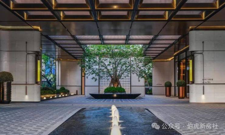 社区入口处, 百米酒店式落客门庭 气宇轩昂,贝金米黄石材的质感尽显尊贵; 大树聚场 ,全冠移植超60年铁冬青,归家的第一眼便满是贵气。 五重礼序园林 (迎、礼、聚、活、登)层层递进,蓝钻大理石 中庭水景 波光粼粼, 躺平水院 爱马仕灰奢石拼花交相辉映,每一处细节都在诉说着海派住区的非凡品质。