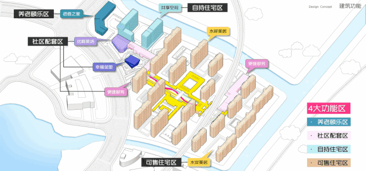 一条连续的公共通廊由海天湖公园引入社区,贯穿三大功能结构区。