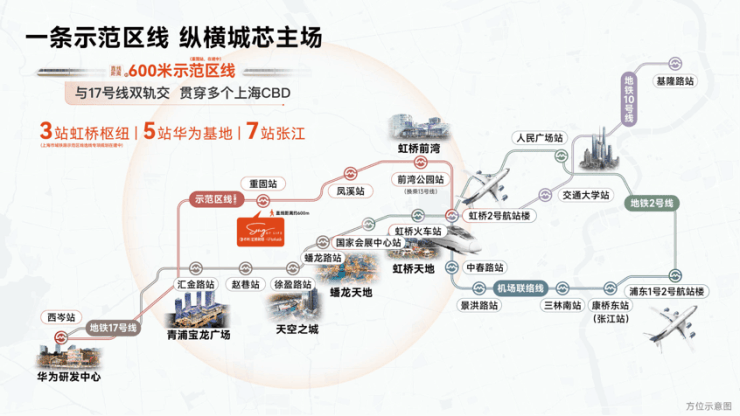 项目直线距离约600米即示范区线重固站(在建中),3站虹桥枢纽、5站华为基地、7站张江,一头链接长三角示范区的虹桥枢纽“动力核心”,另一头链接虹桥大科创时代高地的华为研发基地,未来将获得双向价值溢出。