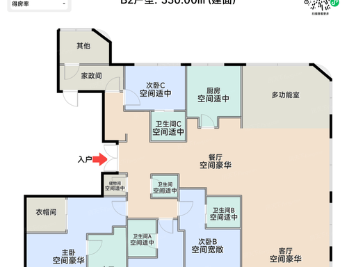 客厅约50㎡、弧形阳台、三开间朝南