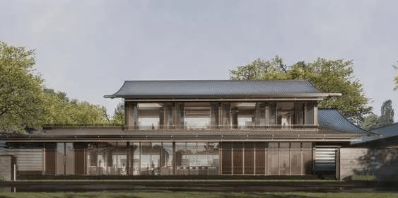 二进青雅叙:青雅叙整栋建筑屋身层层飞檐、基座漂浮架空,巨幕玻璃立面,非常飘逸灵动。