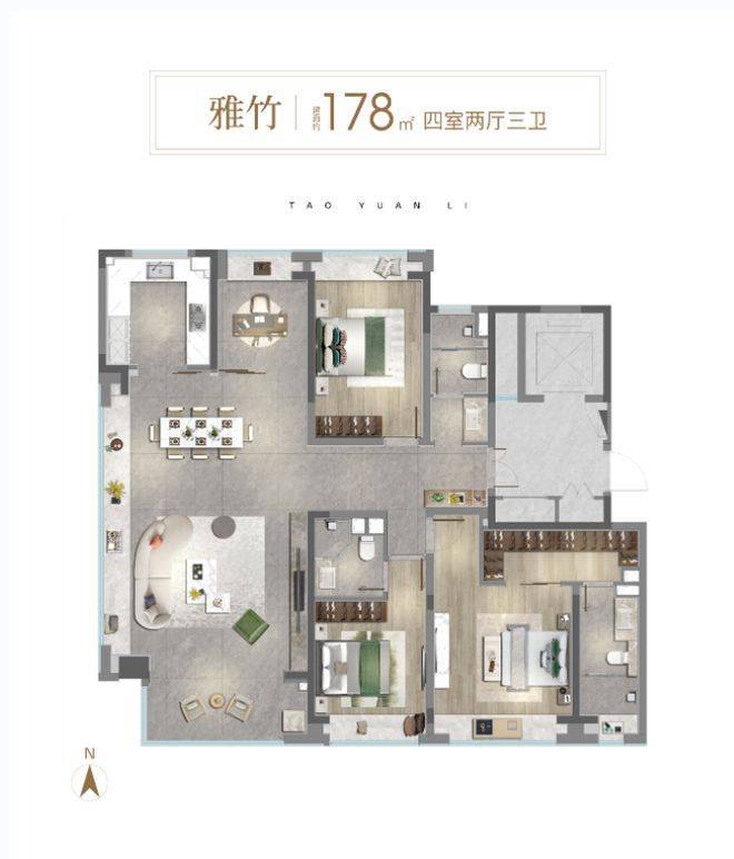 通过新桃源会客厅社区广场与独立社区会客大堂、林荫归家步道、中央景观聚场、品质入户单元昭示性景墙+专属入户铺装、首层精装大堂五大节点,赋予归家路途更多逸趣与美好。