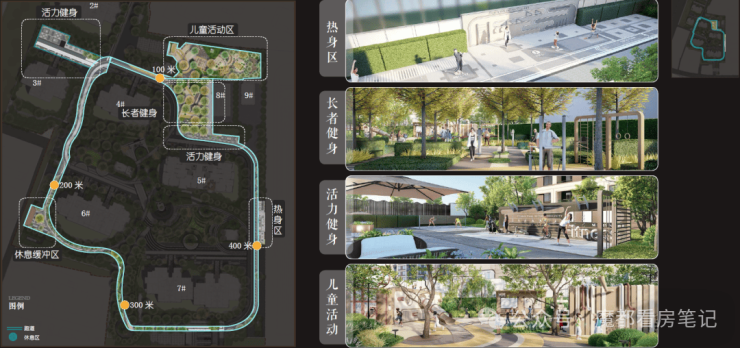 五大运动活力系统:热身区、定制主题儿童活动区、老年健身区、活力健身区和休憩缓冲区,并由约400M跑道串联