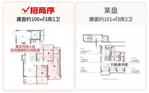 2011年颁布的《中华人民共和国住宅设计规范》中提到:双人卧室不应小于9㎡;招商序每个卧室在阳台“扩容剂”的助力下全部达标,A1户型在百平空间做到了3个双人卧室。