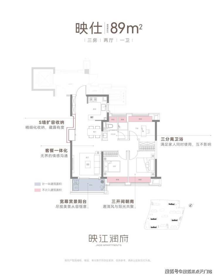 其次是 户型设计。 在户型产品同质化严重的当下,映江润府花更多心思在户型创新设计,给到置业者更美好的家的体验。建筑面积约89㎡王炸小豪宅户型,拥有四大高光细节和创新设计,在市面上同类产品中非常能打。