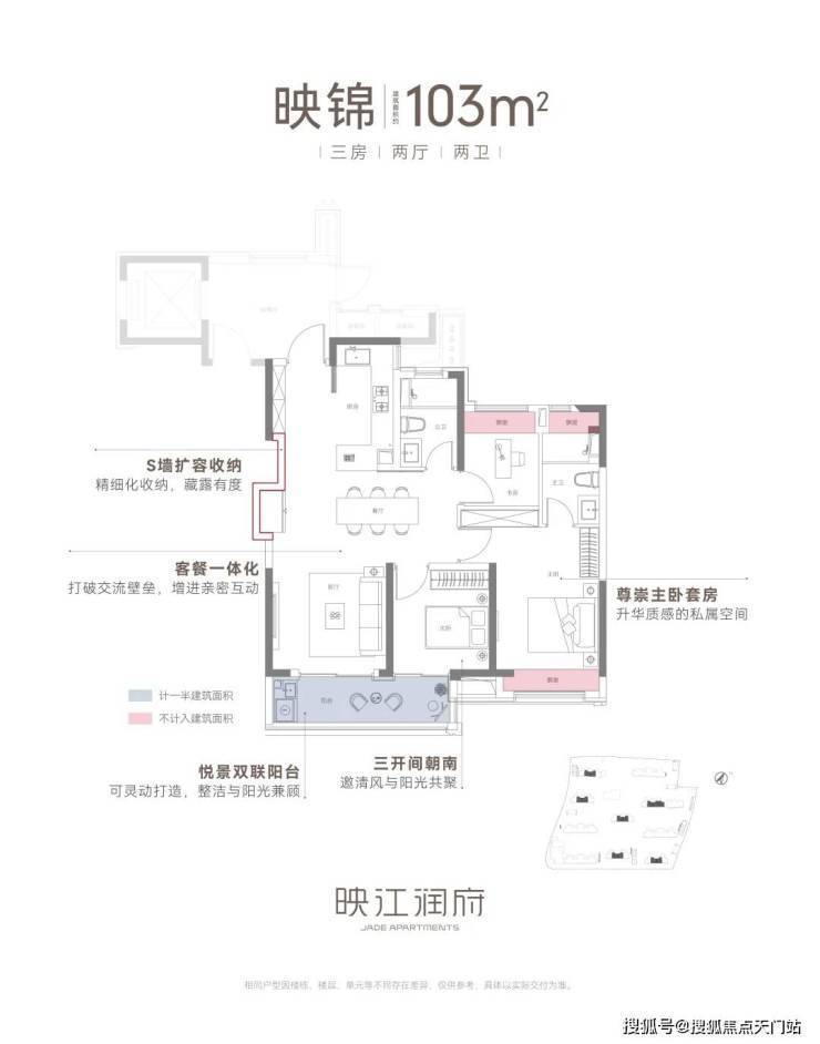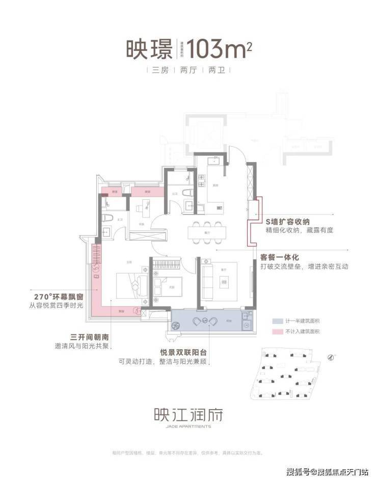 建筑面积约103㎡三房两厅两卫,不失为改善家庭的首选。其中边套户型,映江润府的主卧套房 做了 270°环幕飘窗, 实现无与伦比的采光通风和视野享受,类比于千万级豪宅的体验!