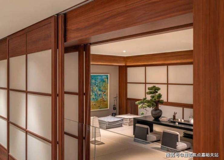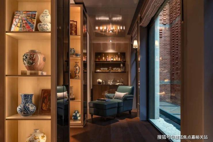 在'町屋'后方,是一个墙面和天花板都覆盖金箔的'金吧'。在这里,我们重新引入了一些当代西方设计语言——大理石地面图案、蛋形吧台和墙面护板细节。这些元素与醒目的红色高光烤漆柜相互平衡。天潼198售楼处预约电话☎:400-8855-420📲✅