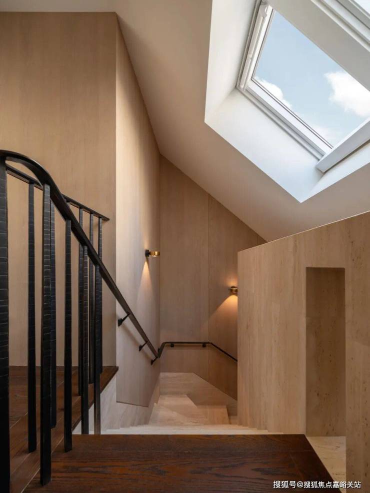一面贯穿地下室至阁楼七层的整体白色洞石墙体构成建筑主轴。楼梯采用纯净简约的设计,作为连接整个住宅的核心元素,与每层的风格相得益彰。