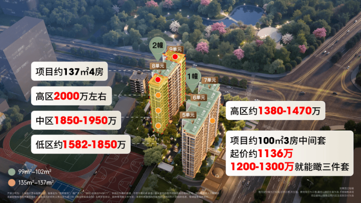 ②、项目约137㎡4房,低区约1582-1850万,中区1850-1950万,高区2000万左右。