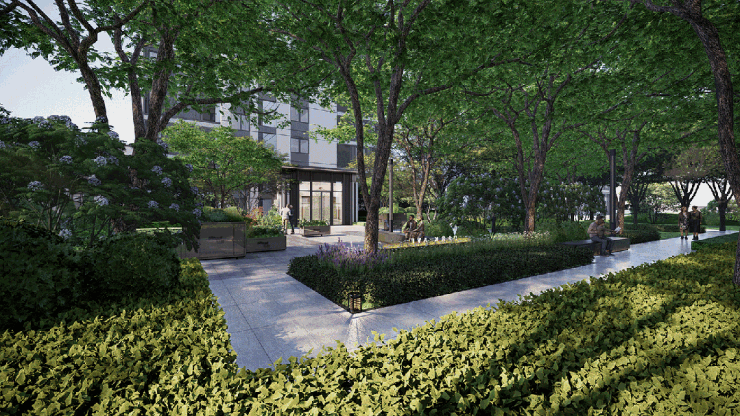 项目规划了“一环一轴三园”景观节点,以高密度绿意景观包裹整个小区,打造绿氧环绕的公园住区。