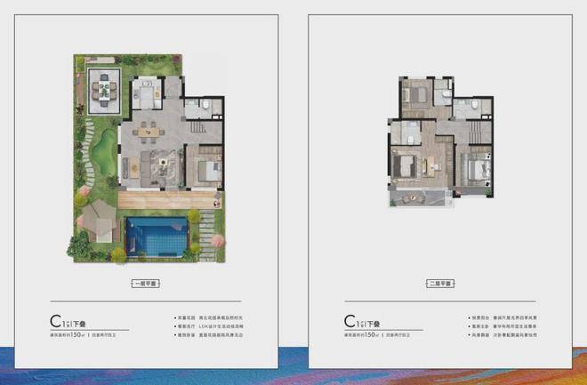 项目户型方面,面积段有两种——建面约95㎡下叠、上叠;建面约150㎡下叠、上叠。