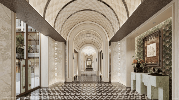 项目以长达280米的贝克米白石材门庭为序,过渡至70米私享厅堂,打造上海首个“中央车站”风格的星级酒店式门厅。