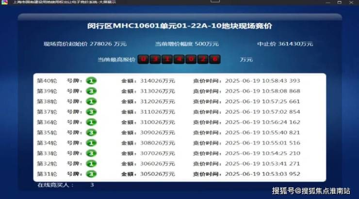 6月19日,2025年上海第五批次土拍,经过40轮竞拍,上海保利发展竞得颛桥镇MHC10601单元01-22A-10地块(即保利都汇和煦),规划用地性质为住宅用地,出让面积4.05公顷,容积率为2。总成交价314026万元,溢价率12.95%。