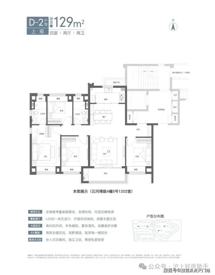 预算充足的小伙伴,可以选 建面约129㎡4房,经典的三卧朝南、边套观景户型。
