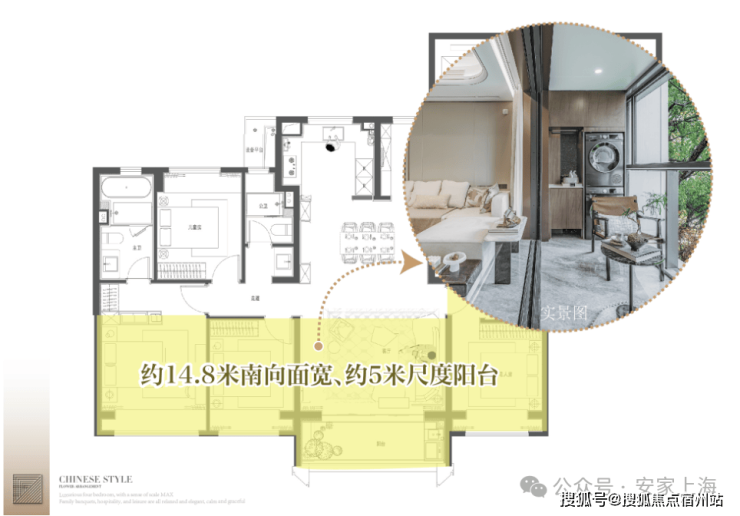 在户型设计的底层逻辑中,154㎡正四房以方正通透为基底,四开间朝南形成约14.8米面宽的 IMAX 级采光面,三间南向卧室与客厅构成阳光横轴,搭配约5米的观景阳台,采光效果极佳。