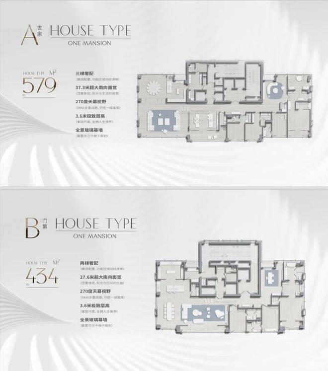 其中,579㎡户型南向面宽可达35米,层高3.6米,搭配270°环幕玻璃幕墙,能实现全景视野,尽享奢华居住体验。