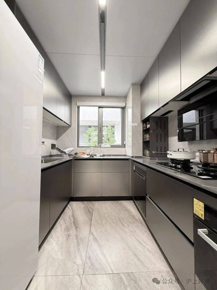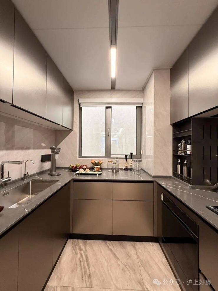 厨房:U型动线设计、高端厨电品牌、人性化设计(双玻璃移门、餐厨地面一体化,后期卫生不留死角)