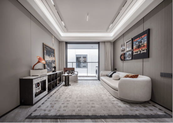 客厅:健康系统,极致工艺(圆弧形吊顶搭配无主灯设计、定制地砖减少拼缝)