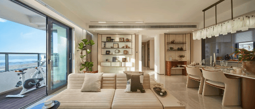 全生命周期户型:户型设计注重空间一体化,以科学尺度诠释改善人居可能性,如约100-144㎡户型采用全景飘窗设计,最大化观海视野,同时满足不同家庭阶段的需求。