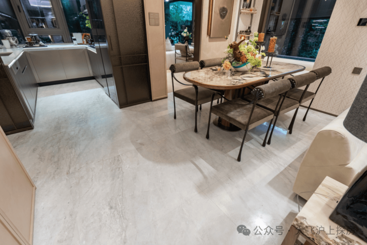 当下在顶豪里流行的弧形元素,项目也全部采用,幻日流光岩板、柳叶拼/鱼骨拼地板、踢脚线、吊顶等,“弧线拉满”,势必要给业主顶豪的居住体验: