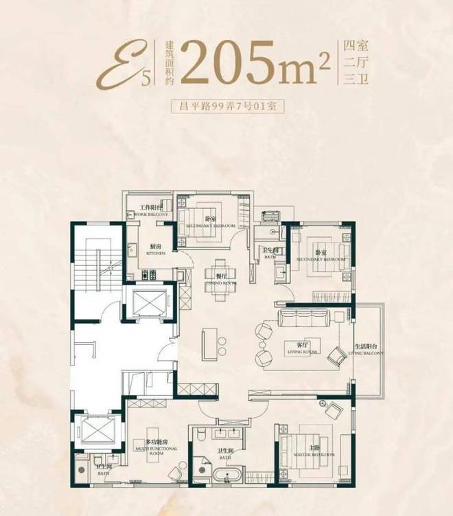 建面约205㎡4房2厅3卫户型昌平•云岸售楼处电话:400-8787-740