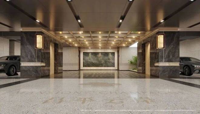 项目一楼设计星级入户大堂!挑高穹顶之下,天然石材与金属线条,交织出当代艺术馆般恢弘气度!