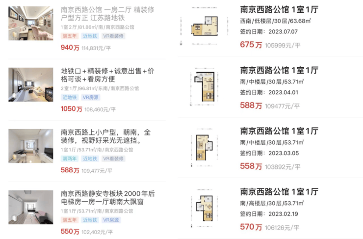 根据链家网显示,南京西路公馆同小区的挂牌单价均在10万以上,成交价总价在600万左右