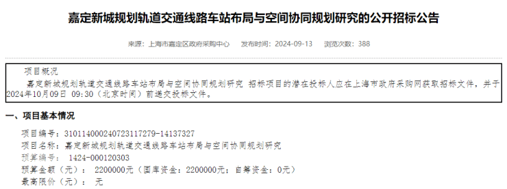 24年9月13日,上海政府采购网发布《嘉定新城规划轨道交通线路车站布局与空间协同规划研究的公开招标公告》。