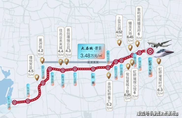 其次,对比大虹桥,大虹桥新房普遍6万+/平方米,二手房则更是突破9万/平方米(如蟠龙天地、万科天空之城等),而车行时间相距仅约15分钟的大名城·映辰仅3.48万/平方米,价差明显,相当于新房的58折,二手房38折。