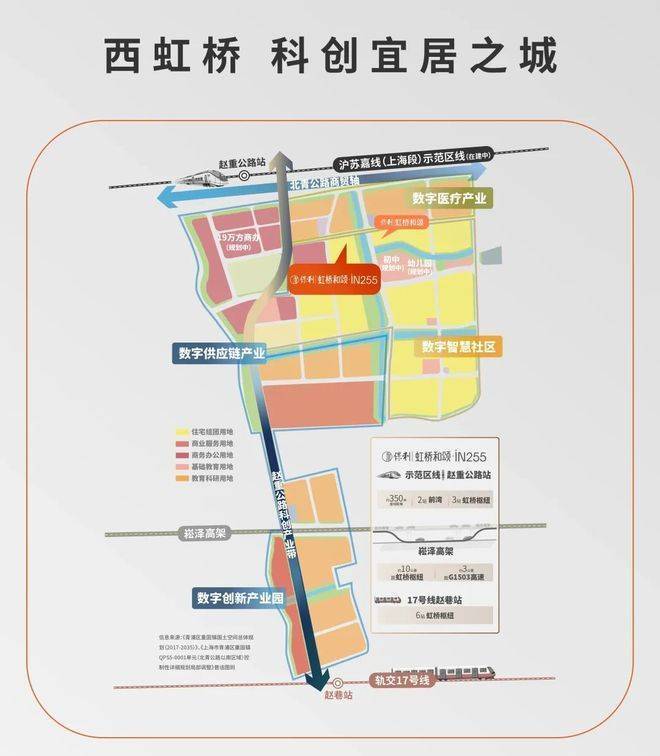 保利虹桥和颂·IN255不仅有轨交规划正在落地,且直线距离示范区线赵重公路站(在建)仅约350米,是不可多得的真轨交盘,2站前湾、3站虹桥枢纽、5站华为基地。