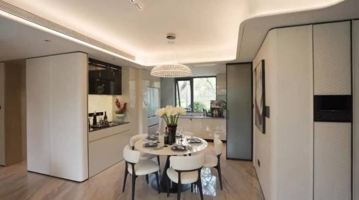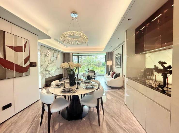 中环铂樾客餐厅一体化设计,远超同类面积标准的大尺度餐厅,不仅放得下圆形大餐桌,旁边还配备了餐边柜,剩余空间依然阔绰从容!