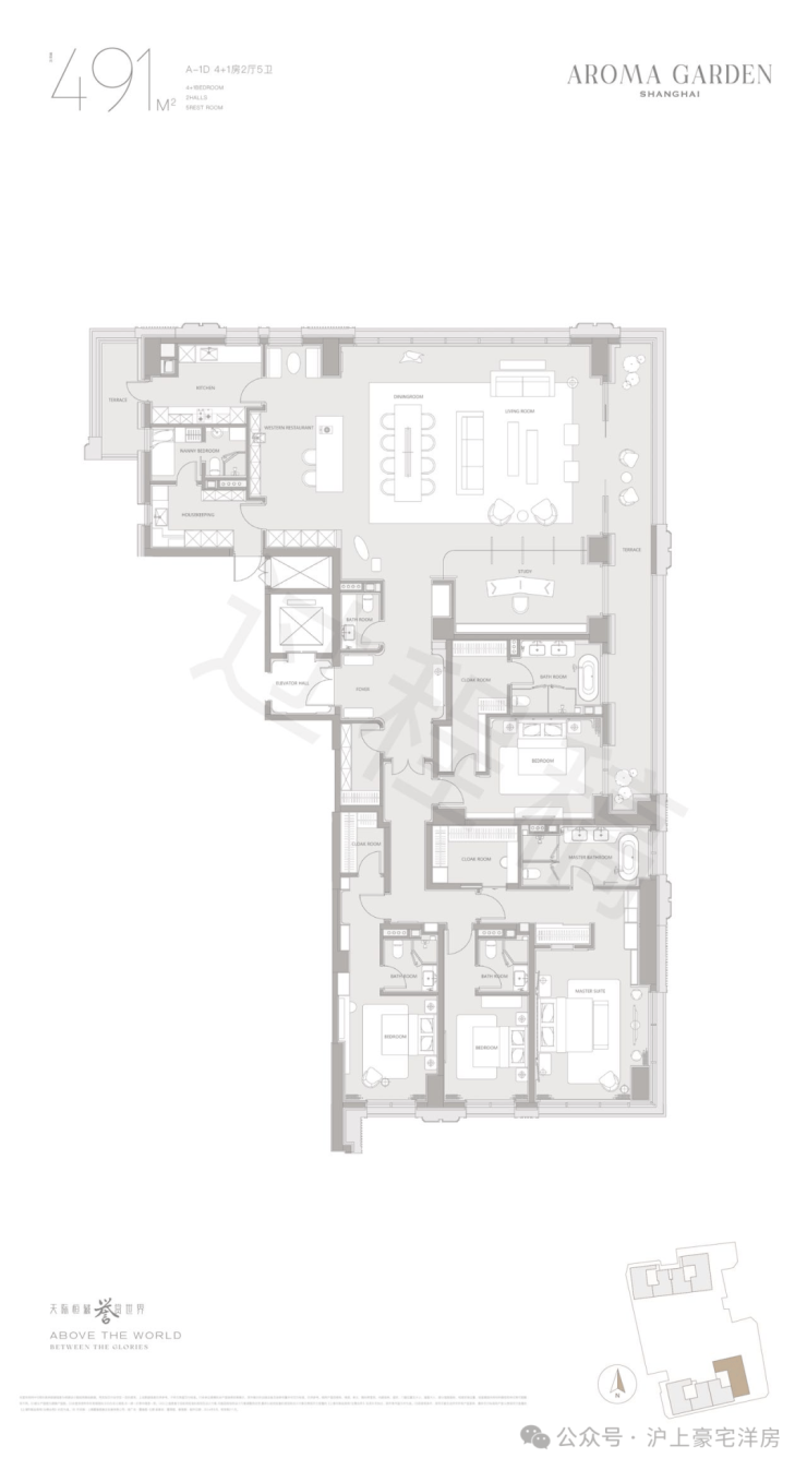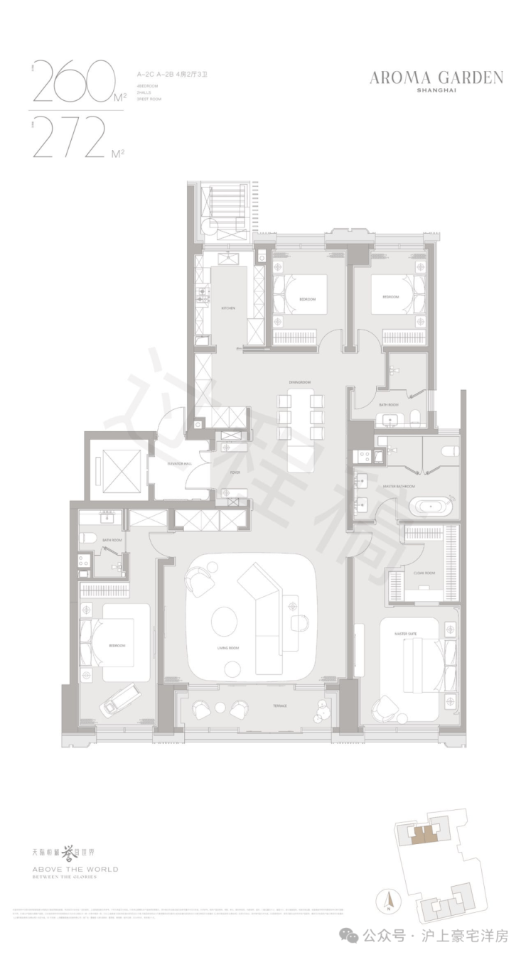 高层户型规划主力面积在260-882㎡区间。豪华主卧套房设计(部分户型为全套房设计),逾百平方客餐厅一体+270度转角落地窗+超宽尺度花园阳台,臻选智能化家居系统及世界顶级精装品牌,赋予居家艺术与智慧生活全新表达。
