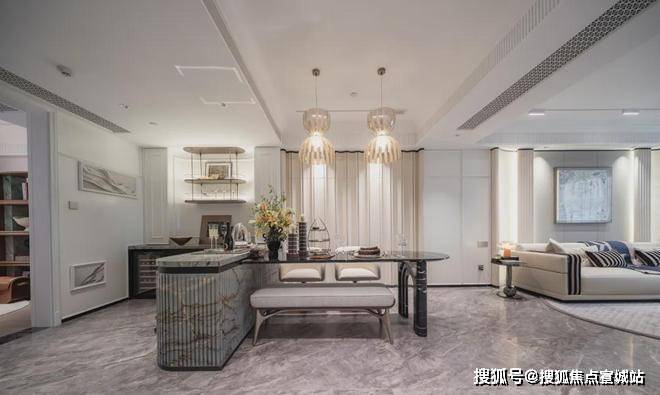 过度用的是白色木饰纹的背景墙,简约耐看;餐厅处又是白色皮革背景墙,大方优雅!整个空间过渡自然,增加了层次感和高级感!