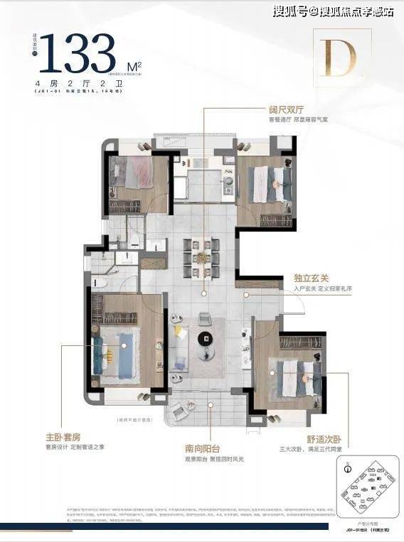 建筑面积约133㎡/143㎡四房两厅两卫,大开间,在满足空间感的基础上,增加户型的功能性,承载生活高舒适度;其中建筑面积约133㎡的四叶草户型,主卧套房设计,三代同堂各有私密天地;南向观景阳台,饱览阳光美景,双卫设计,提供更多私密空间与生活便利。
