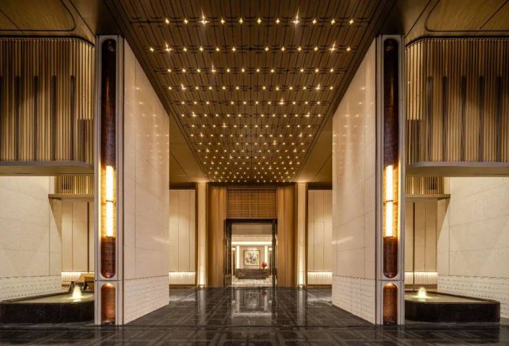 鎏金塔冠 , 采用曲面拉伸铝网,包裹古铜色铝板,用金属的筋骨雕刻出无数个优雅的弧面,勾勒出静安的天空。