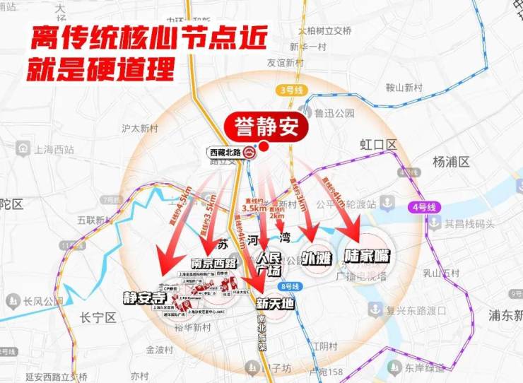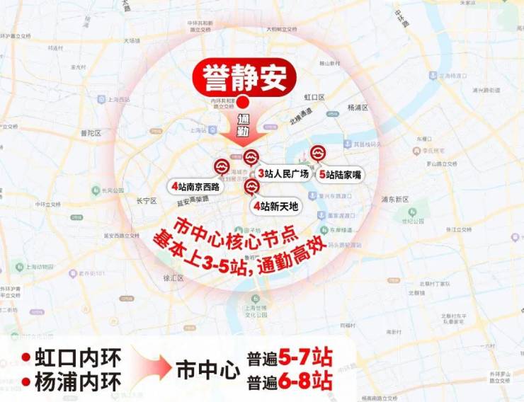 能3-5站直达静安寺、南京西路、人广、陆家嘴的区域,大多是黄浦、徐汇内环,新房单价近20万/㎡;而虹口、杨浦内环,到传统市中心普遍超过3-5站,通勤效率不如这里,总价门槛却比誉静安高出约500万。